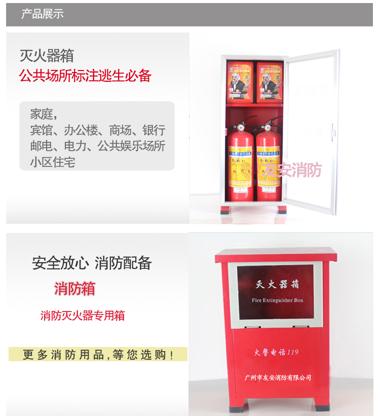 產(chǎn)品介紹:滅火器箱是專門用于長期固定存放手提式滅火器的箱體。按放置型式,可分為置地型和嵌墻型兩種。按開啟方式可分為開門式和翻蓋式兩種。滅火器箱體使用薄鋼板、鋁合金等金屬材料制造。