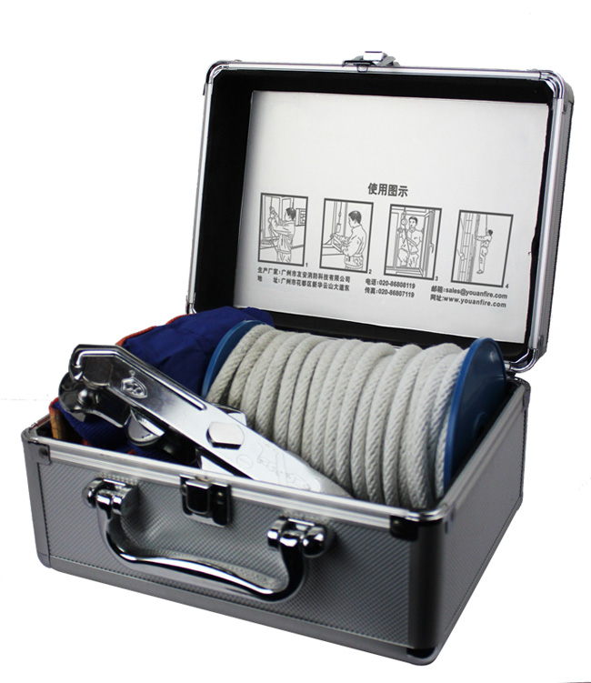 1.打開鋁合金箱,先取出繩盤,將繩盤上的掛鉤掛在掛板上固定好,然后把繩盤從窗外放下;