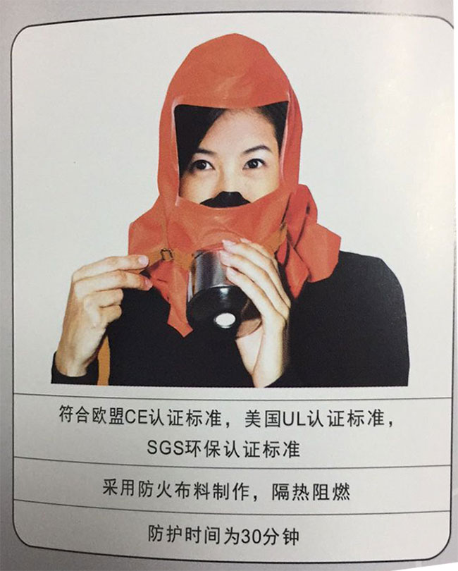 The purify air is an atmospheric, air-purifying negative pressure, filtration device with a flame resistant hood. The product provides respiratory, head and eye protection to facilitate evacuation form hazardous fire and toxic gas atmospheres. This kind of respirator is an essential personal poison-gas-protecting respiratory apparatus if a life emergency happens in hotels, office building, department stores, banks, posts and telecommunications, power industries, public entertainment places or dwelling housed