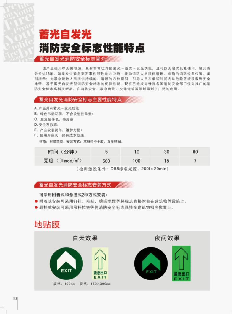 該產(chǎn)品使用中無(wú)需電源,具有非常優(yōu)異的吸光-蓄光-發(fā)光功能,且可以無(wú)限次反復(fù)使用,使用壽命長(zhǎng)達(dá)15年。如果發(fā)生緊急突發(fā)事件導(dǎo)致電力中斷,能為消防人員提供清晰、準(zhǔn)確的消防設(shè)備位置、類別指示;為緊急疏散人員提供持續(xù)的、清晰地方位指引,引導(dǎo)人員在最短時(shí)間內(nèi)從危險(xiǎn)區(qū)域疏散到安全地帶?;谛罟庾园l(fā)光型消防安全標(biāo)志的優(yōu)異性能,現(xiàn)在已經(jīng)成為世界各國(guó)消防安全部門優(yōu)先推廣的消防安全標(biāo)志高科技新品,在消防安全、緊急疏散、交通運(yùn)輸?shù)阮I(lǐng)域得到了廣泛的應(yīng)用。